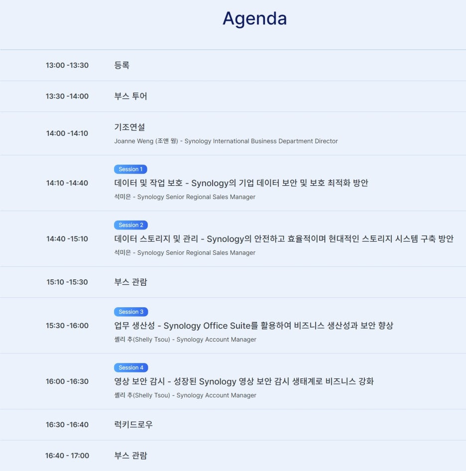 실제 솔루션 데이에서는 조앤 웡 매니저의 기조연설을 시작으로, 석미은,셀리 추 매니저의 시놀로지 데이터의 안전성, 시놀로지 오피스 슈잇의 협업기능과, AI 기능, 시놀로지의 영상 보안 감시 시스템, 등 도움이 많이 되는 내용들이 많았습니다.