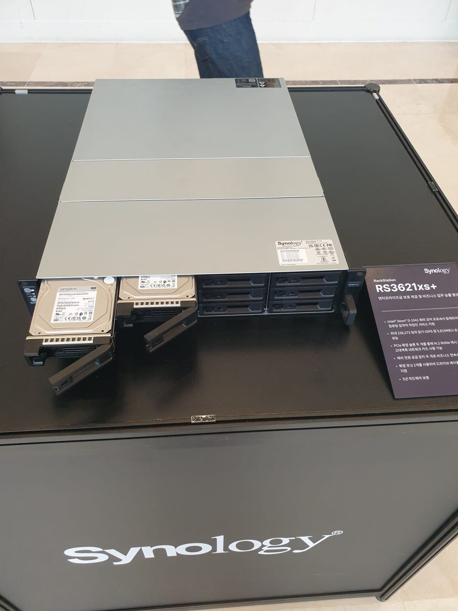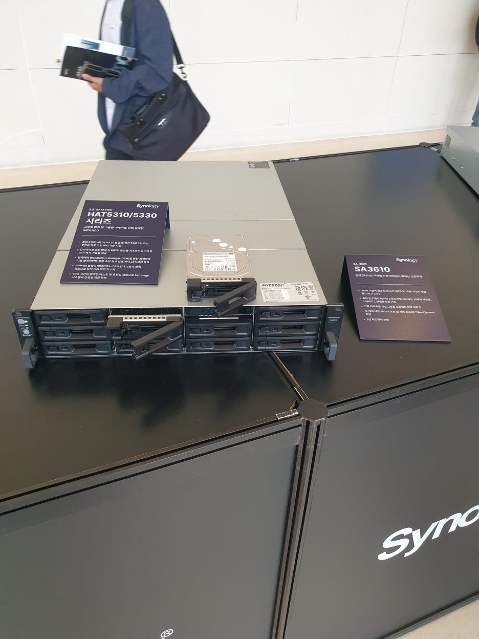 행사장내부(더케이호텔 양재) 가방을 내려놓고 자리를 잡은뒤(전 4번째줄... 저는 이런세미나에 가서도 엄청 잘보고,잘듣고, 공부하는 스타일이라서..ㅎㅎ) 부스 관람을 시작했습니다. 맨 먼저 시놀리지 올플래쉬스토리지인 FS 시리즈가 보이네요. 다른벤더사들의 올플래쉬 스토리지를 DB서버용으로 몇번 납품했는데, DB나 SQL 튜닝이 필요할까 싶을정도로 압도적인 속도가 나옵니다. 10년 이상치의 DB의 통계가 뽑히더라구요..ㅎㅎ, 백업시간도 1/5~10 정도로 엄청 줄어듭니다.