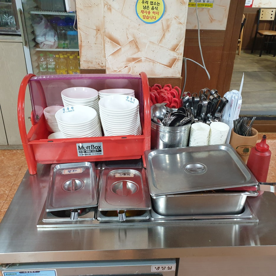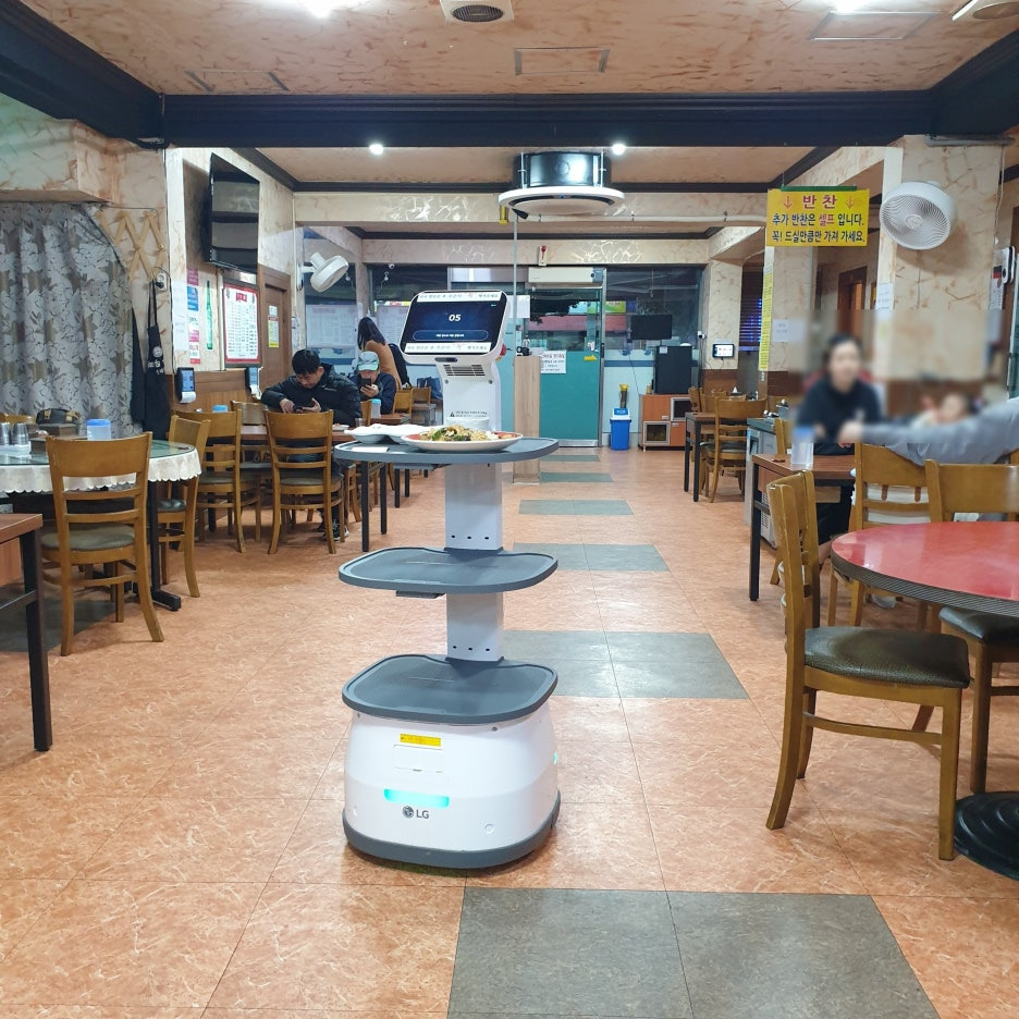 사진을 보시면 아시겠지만, 오래된 노포의 느낌이 강합니다. 식탁, 의자도 요새거 같지는 않네요..여기도, 역시 셀프바..ㅎㅎ 이런 시골느낌의 노포에 배달 로봇이 돌아다닙니다. 그것도 2대나, 좀 이색적인 느낌이네요..ㅎㅎ