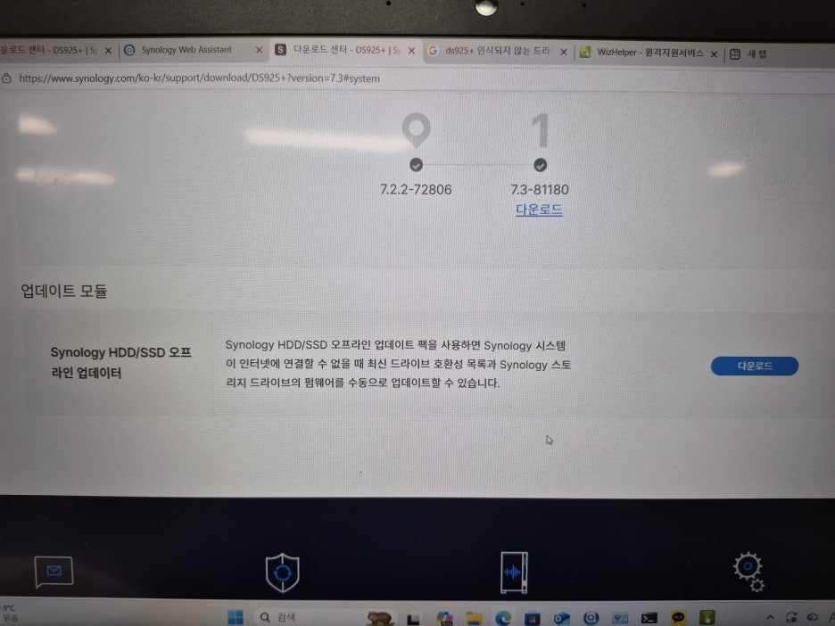 DS925+ 드라이브 인식안됨 위의 에러는 아래그림과 같이 HDD/SSD 업데이트 팩을 다운받아 설치 하면 해결이 됩니다.
