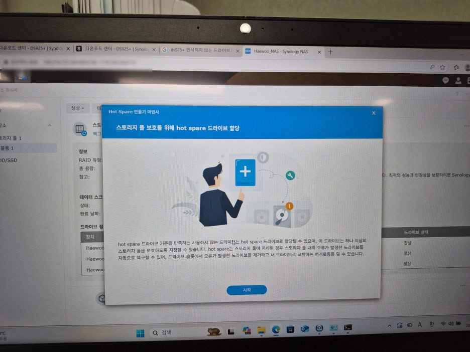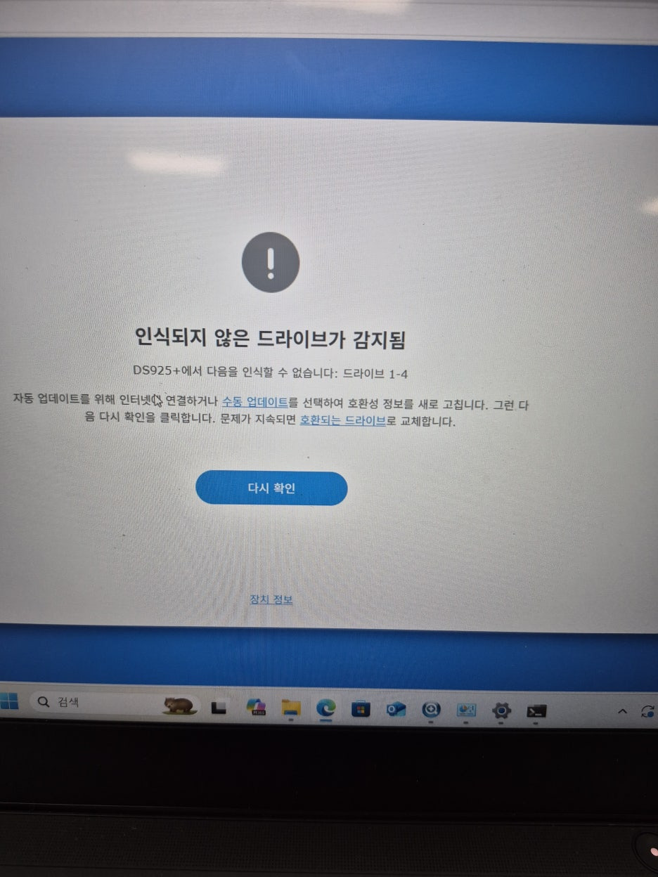 DS925+ 드라이브인식안됨 에러 해결 인식되지 않은 드라이브가 감지됨 에러를 해결하고, DSM7.3 을 설치 완료 했습니다. 25가 붙는 모델부터는 원래 시놀로지 전용하드를 써야지만 인식이 되지만, 고객들의 반발로 인해서, DSM 7.3 부터 일반 하드디스크(HDD) 가 인식이 됩니다. 개인들이나 마니아 들은 시놀로지 전용파트보다 서드파티 부품을 쓰시는것도 좋은방안이나, 기업이면, 시놀로지 전용하드 나 파트로 제안드립니다. 그러나 시놀로지가 전용파트들에 제가 봐도 너무 비싸게 가격책정을 한것 같아서, 업체인 저도 좀 불만이 많습니다. HPE나 DELL 정도 되는 글로벌 업체도 특별한 경우가 아니면, 생각보다 파트가 저렴하거든요~~