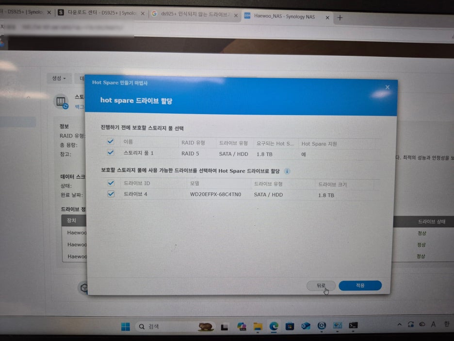 ds925+ 핫스페어구성(Hot Spare) 모든 작업을 마무리하고, admin 계정, 포트변경, 방화벽 설정,스냅샷 설정등에 대해서 기본 정보를 알려드리고, 마지막으로 렉에 , 설치해 드렸습니다.