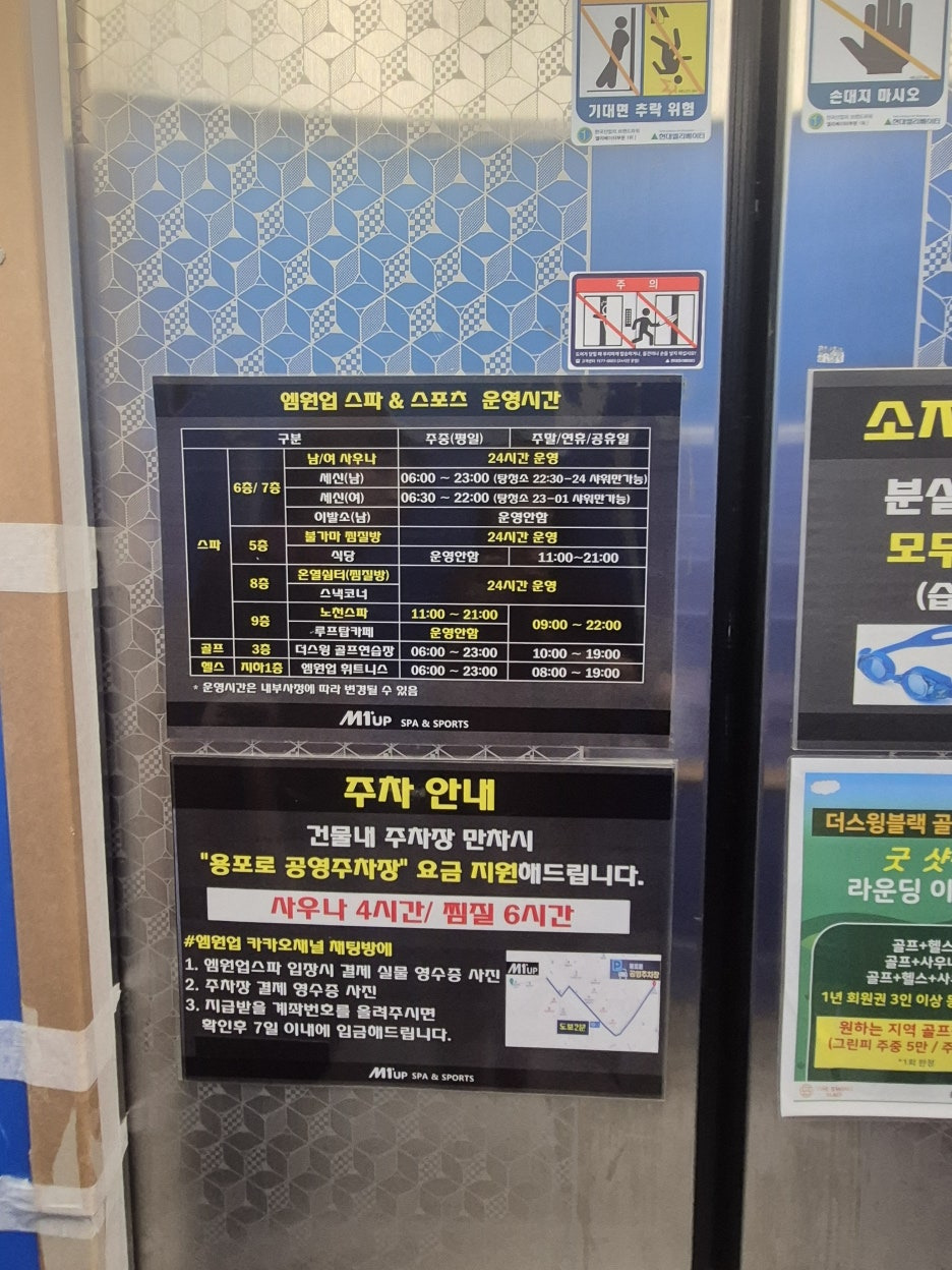 먼저 주차장은 아래사진과 같이 나와있으나, 기본 12시간이 무료라서, 찜질하고 쉬고 가기에는 최적의 조건입니다. 사람이 너무 많아서, 사진찍기가 힘들었습니다..ㅠ.ㅠ 아래사진에 엠원업스파의 모든층들에 대한 설명이 들어있네요....