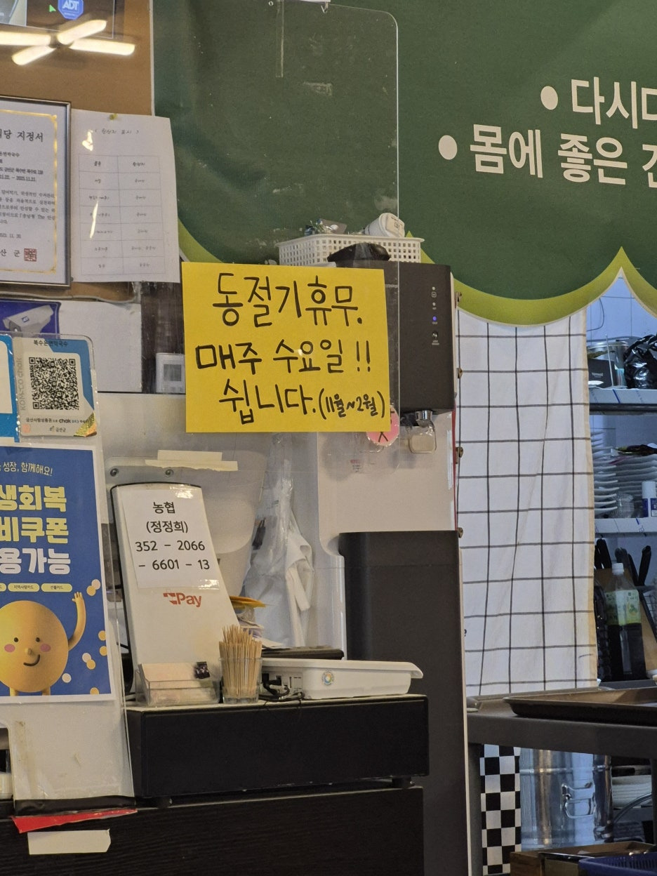 복수 온면. 막국수 손님이 없어 불안감을 머금고, 식당안으로 들어갔습니다..ㅎㅎ 웨이팅 공지도 있고 하는것 보니, 맛집은 맛는것 같습니다. 주인사모님이 가게를 소탈하게 잘 꾸며 놓으셨네요~~ 11~2월까지는 매주 수요일 휴무네요...