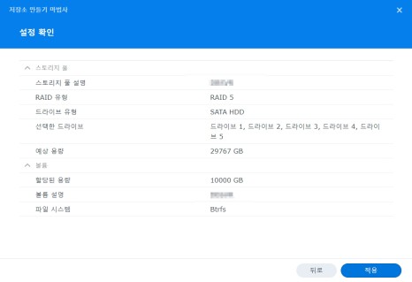 10. 이제 레이드 설정화면으로 넘어갑니다. 여기서 레이드 설정과 스토리지 풀과 볼륨을 만들수 있습니다.(저는 스토리지 풀1개와 볼륨 2개를 생성할 예정입니다. 가장 중요한 DB서버에 별도의 볼륨을 줘서, DB서버와 나머지 서버들을 분리할 예정입니다)