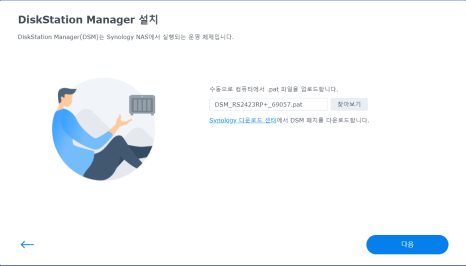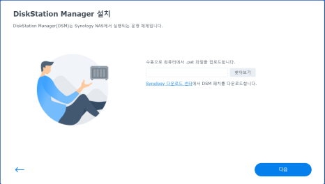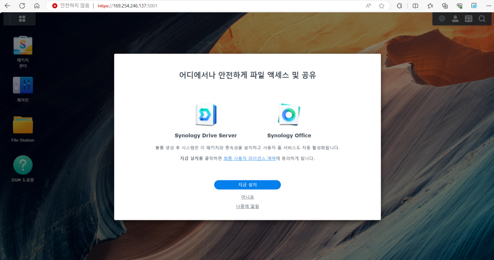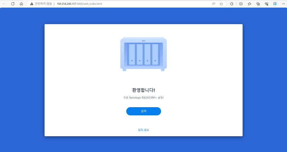 2. 아래사진과 같이 웹브라우저에 시놀로지 어시스턴트에서 검색된 IP를 입력하면, 아래그림과 같이 설치화면이 시작됩니다.