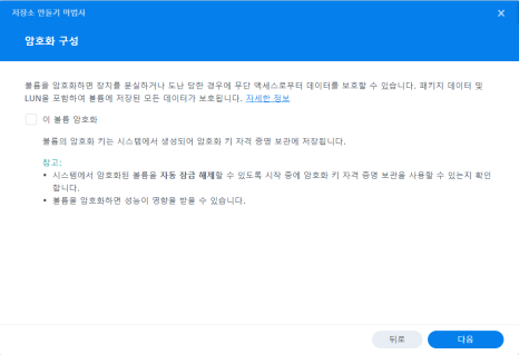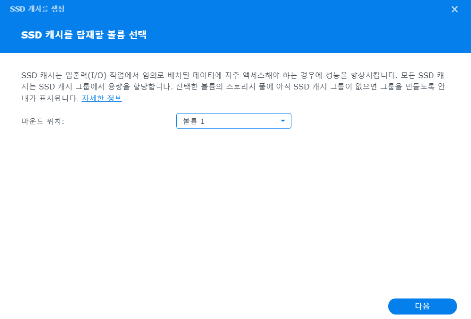 19. 다음으로 SSD 캐시를 탑재할 볼륨을 선택합니다. (저는 볼륨을 2개로 잡을거라서, 일단 볼륨1에 조금만 잡을 예정입니다. 볼륨1에는 오라클 DB를 PUMP 및 EXPORT로 백업을 받은다음, 매일매일 새벽에 시놀로지로 COPY 하는 스크립트를 작성할 예정입니다. 오라클 PUMP 및 EXPORT는 파일크기가 작지 않으므로, 나머지 볼륨에 더 많은 캐시를 할당할 예정입니다.)