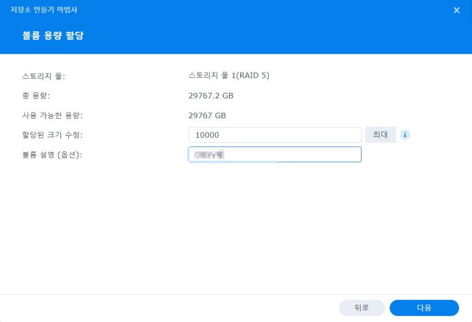 13. 다음으로, 볼륨 크기를 설정하는 화면에서, 원하시는 볼륨크기를 할당하시면 됩니다.(저는 볼륨을 2개로 나눌것이기에 최대크기가 아닌, 10테라바이트로 설정했습니다.)