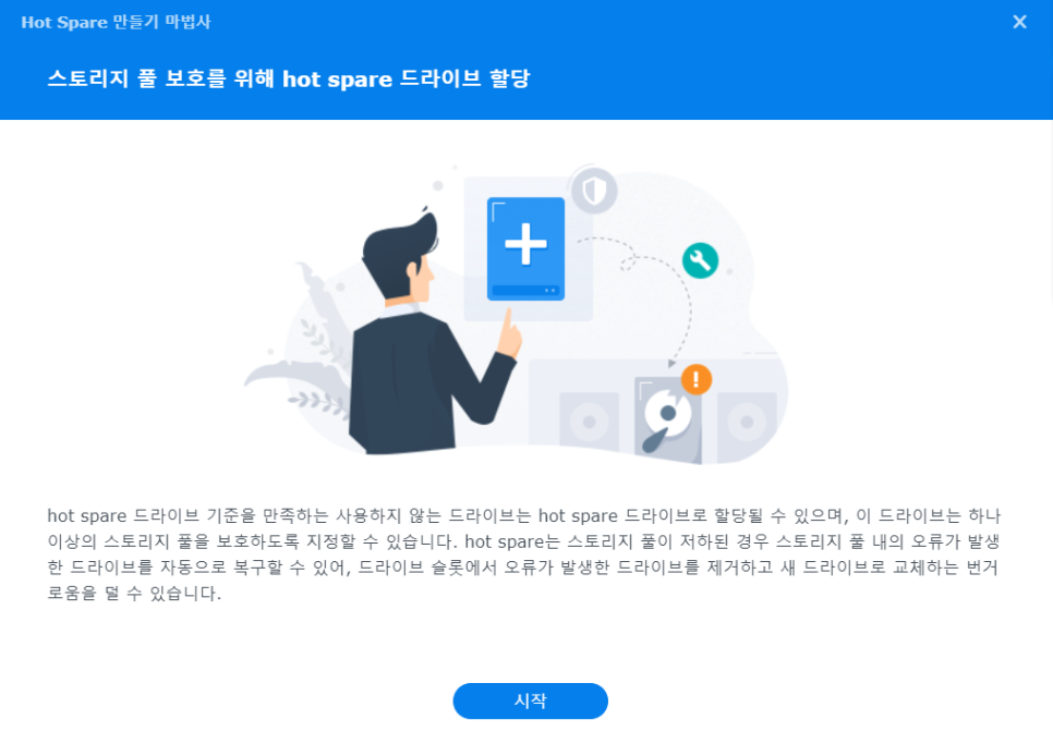 11. 아래 설정화면(사진1) 에서 시작을 클릭후 2번 사진처럼 레이드 레벨을 정해줍니다. (개인의 기호에 따라, SHR, RAID6를 선택하셔도 됩니다. 이 매뉴얼에서는 Raid 5로 설정합니다.)