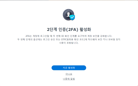9. DSM 7.2 설치가 끝나고, 다시 아래처럼 2단계인증 활성화 여부를 물어보는데요, 일단 초기 설치에서는 저는 아니요로 넘어 가겠습니다. (향후 모든 설치가 끝나면, 2단계 인증을 활성화 할수 있습니다.)