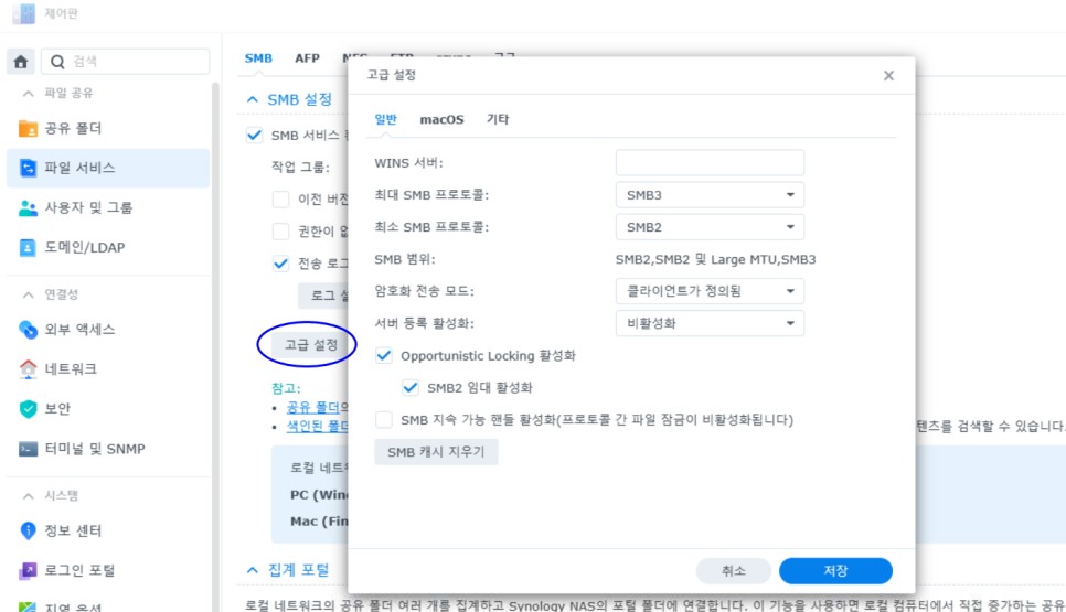 3. 제어판 => 파일서비스 => SMB => 고급설정=> 일반에서, 아래와 같은 새창이 뜨며, 여기서 최대SMB 프로토콜을 SMB3로 해놓으시면 됩니다.(보통은 기본으로 셋팅되어 손대실게 없습니다.)