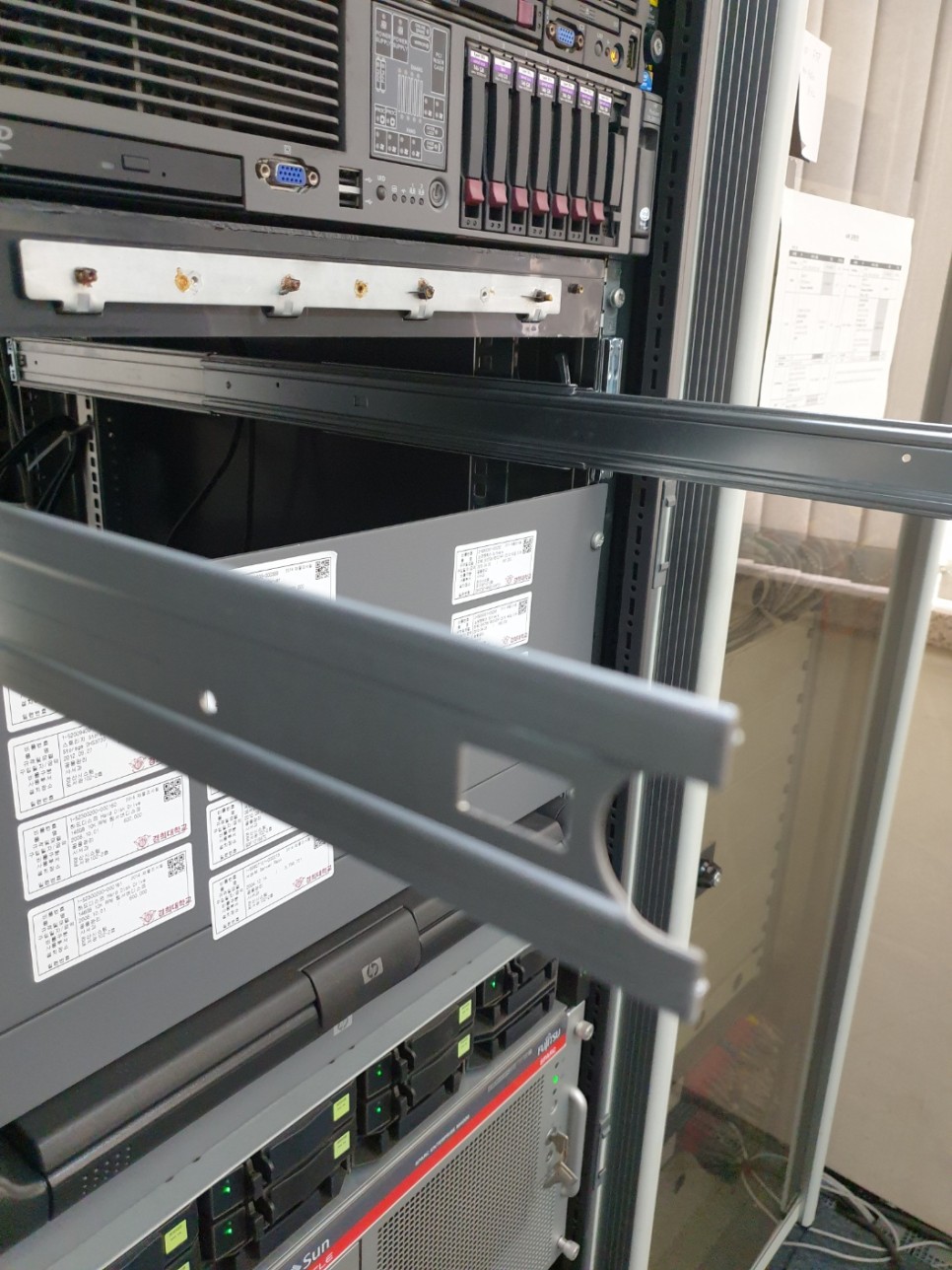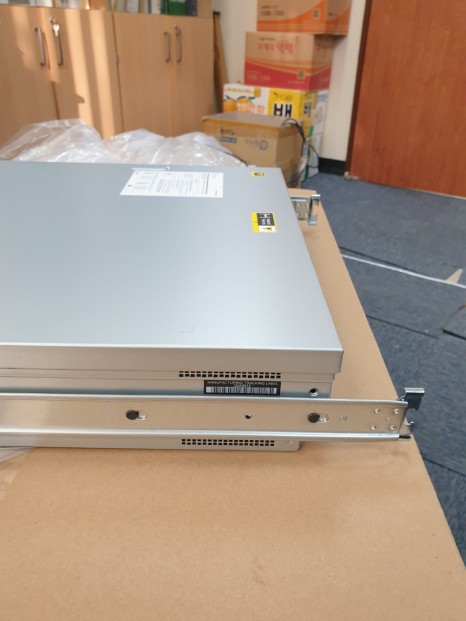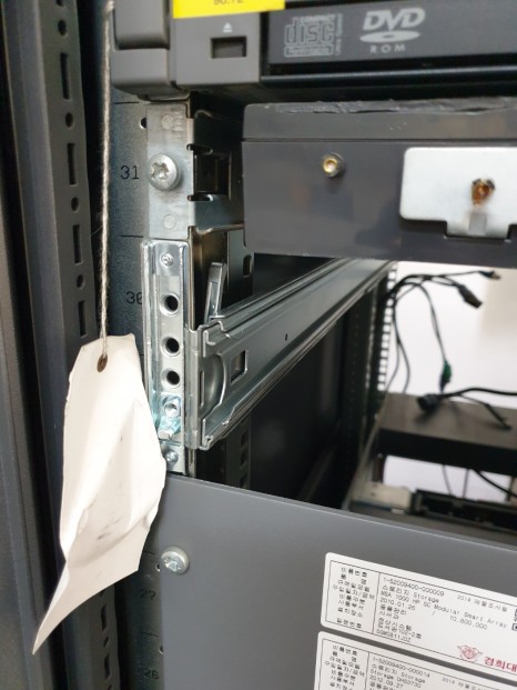 서버에 레일킷 부속 장착완료 4. 설치전 랙에 장착해 놓았던, 레일을 앞으로 꺼내놓습니다.
