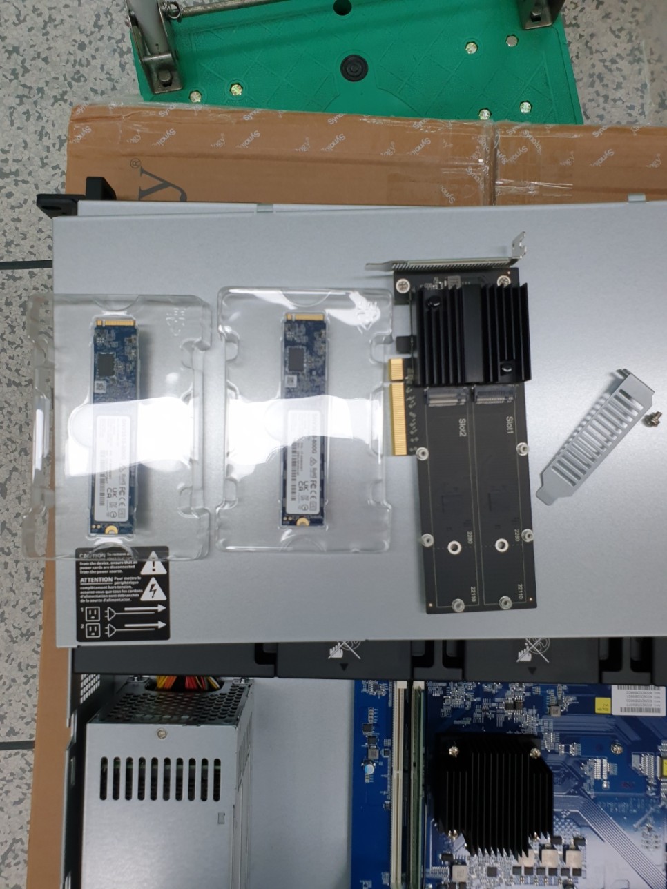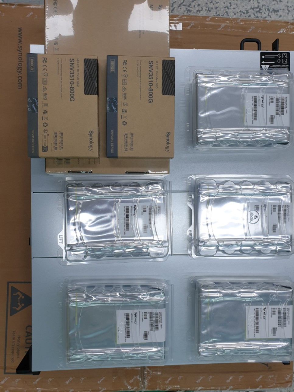 2. 박스 오픈하여, 본체, 디스크, M2D20 PCI카드, 캐쉬메모리 검수중입니다.