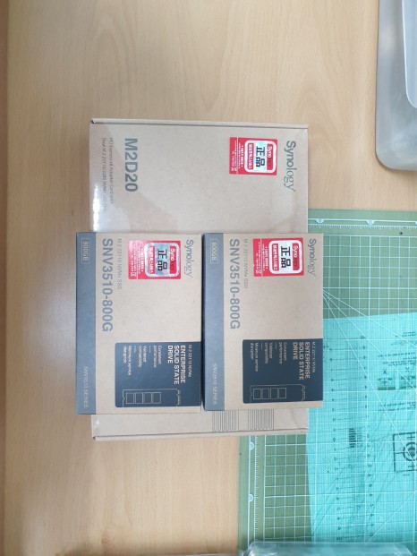 2. 옵션부품인 Rail Kit RKS-02, M.2 NVMe SSD SNV3000 Series SNV3510-800G, M2D20 Dual-slot M.2 SSD adapter card 사진을 촬영한 것입니다.